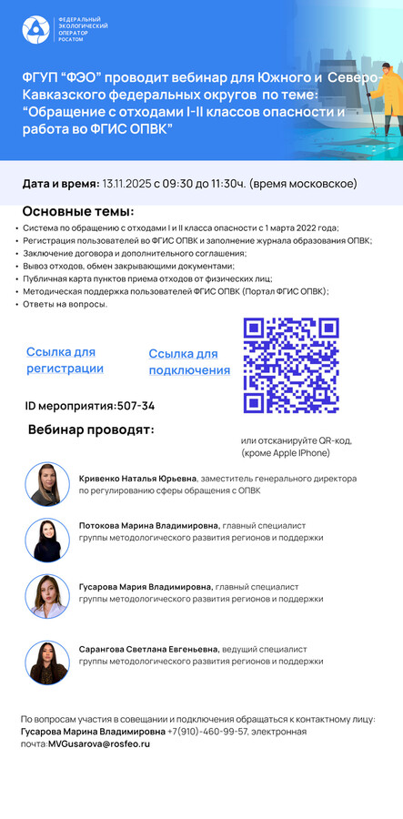 ФГУП "ФЭО" проводит вебинар для Южного и Северо-Кавказских федеральных округов по теме: "Обращение с отходами I-II классов опасности и работа во ФГИС ОПВК"